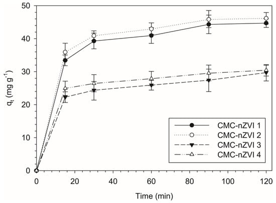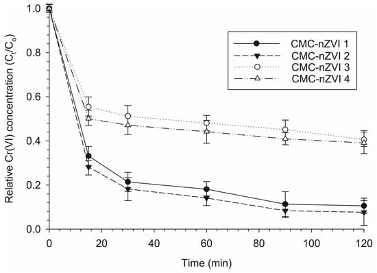 Effect of pH and IS on removal capacity of Cr(VI) (CMC-nZVI 1, pH 5 and 0.01 M; CMC-nZVI 2, pH 5 and 0.001 M; CMC-nZVI 3, pH 7 and 0.01 M; and CMC-nZVI 4, pH 7 and 0.001 M). Initial Cr(VI) concentration is 100 mg L−1 and the CMC-nZVI concentration is 250 mg L−1. The vertical bars represent the standard deviation of the measurements.