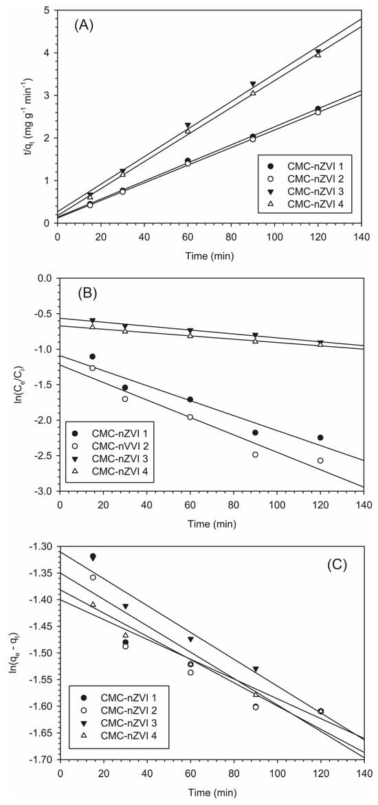 Effect of pH and IS on the reaction kinetics of Cr(VI) using the pseudo-second-order, (A); the Langmuir–Hinshelwood first-order, (B); and the pseudo-first-order, (C) kinetic models. (CMC-nZVI 1, pH 5 and 0.01 M; CMC-nZVI 2, pH 5 and 0.001 M; CMC-nZVI 3, pH 7 and 0.01 M; and CMC-nZVI 4, pH 7 and 0.001 M). Initial Cr(VI) concentration is 100 mg L−1, and CMC-nZVI concentration is 250 mg L−1.