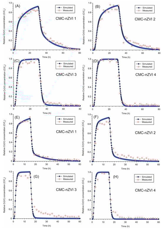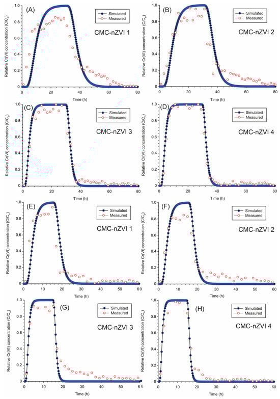 Modeling the transport of Cr(VI) under uniform flow conditions revealed that the relative concentration (RC) of Cr(VI) was increased by increasing the pH of the CMC-nZVI suspension from 5 to 7. The average retardation was 3.51 and 1.61 at pH values of 5 and 7, respectively, which could explain the larger transport of Cr(VI) at pH 7. The breakthrough curves (BTC) of Cr(VI) always showed earlier arrival and a shorter time to reach a maximum RC at pH 7 as compared to the same values at pH 5 (Figure 9). For example, simulations based on the flow rate of 2 cm h−1 showed that breakthroughs of Cr(VI) occurred after an average of 3.62 and 1.75 h when the pH of the CMC-nZVI suspension was 5 and 7, respectively (Figure 9A–D). Similarly, the average time required to reach maximum RC was 28.75 and 15.75 h when the pH of the CMC-nZVI suspension was 5 and 7, respectively (Table 6).