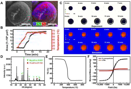 Fabrication and characterizations of the LPMs. (A) Scanning electron microscopy (SEM) and energy dispersive spectrometer (EDS) images of a typical LPM, scale bar: 100 μm. (B) With increasing ambient temperature, the overlooking area of LPM on a two-dimensional plane changes with time, indicating the occurrence of phase transmission. (C) The corresponding time-lapse images of experiment and simulation under a bright field, scale bar: 100 μm. (D) X-ray diffraction (XRD) analysis of LPMs. (E) The thermogravimetric (TG) curve of LPMs. (F) Magnetization curves of Fe nanospheres and LPMs measured form a vibrating sample magnetometer (VSM) at 18 °C.