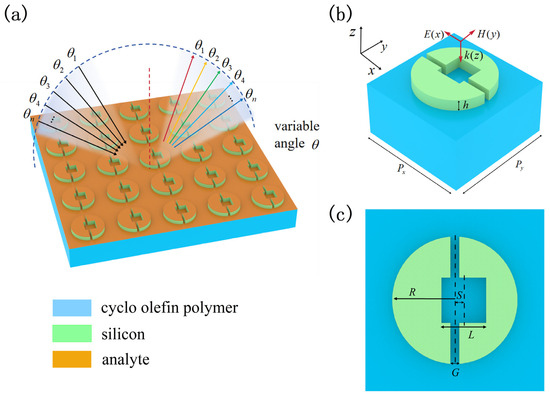 (a) Schematic diagram of the Si split ring metasurface which supports quasi-BIC. THz waves incident on the metasurface at different angles. (b) The unit cell of the metasurface. (c) The plan view of the unit cell.