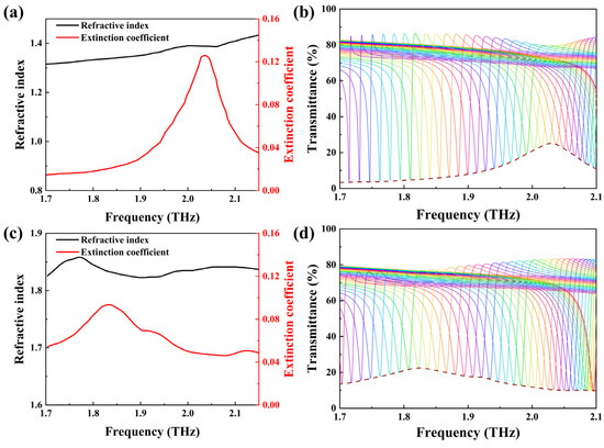 where is the propagation length of the THz pulse, is the refractive index, is the extinction coefficient, is the ratio of the amplitude modulus of the reference signal and the sample signal after passing through a sample, and is the phase difference between and . In Figure 4a, it can be seen that the refractive index of melamine has a little variation with an average value of 1.35, while its extinction coefficient demonstrates remarkable change with a maximum value of 2.03 THz that corresponds to the fingerprint of melamine. Figure 4b shows the transmittance spectra after angle-scanning of the metasurface with a 2 µm thick melamine layer. The red curve is the envelope line extracted from the resonance dips. It can be observed that due to the optical loss of melamine, the envelope curve exhibits a maximum transmittance of about 25.2% at 2.03 THz, corresponding to the fingerprint of melamine. This validates the feasibility of our sensor for analyte detection. Figure 4c illustrates the refractive index and extinction coefficient of vanillin within the frequency range of 1.7 to 2.15 THz, also obtained using a THz-TDS system [41,42]. A characteristic absorption peak of vanillin is observed at 1.83 THz, with a maximum extinction coefficient of 0.094 and an average refractive index of approximately 1.84. The transmittance spectra after angle-scanning of the metasurface with a 2 µm thick melamine layer are shown in Figure 4d, with the envelope exhibiting a maximum transmittance of about 22.5% at 1.83 THz. The non-overlapping characteristic absorption peaks of these two additives provide the necessary conditions for the detection.