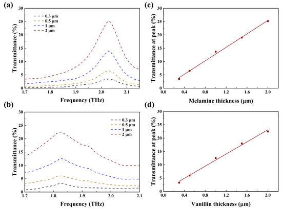 To further evaluate the ability of fingerprint detection, the additives of different thicknesses are coated on the metasurface. Figure 5a,b depict the envelopes of melamine and vanillin deposited with thicknesses of 0.3 μm, 0.5 μm, 1 μm, and 2 μm, respectively. As the thickness increases, the transmittance at the peak of the envelope also increases. For melamine, this value increases from 3.5% to 25.2%. For vanillin, this value increases from 3.3% to 22.5%. Considering the signal-to-noise ratio of the actual THz-TDS system, the detection limits for vanillin and melamine are 52.8 μg cm−2 and 78.5 μg cm−2 [19]. Figure 5c,d show the transmittance values at their peaks for melamine and vanillin with the thickness ranging from 0.3 to 2 µm. It can be observed that the peak transmittance shows a good linear dependence on thickness. The red line is fitted through these five points, yielding the following equations: y = 0.126x + 0.002 (melamine) and y = 0.114x + 0.004 (vanillin). These two slope values can partially reflect the sensitivity of the detection. Different slopes of these two fitting curves stem from the different extinction coefficients of the two additives. Melamine exhibits a higher peak extinction coefficient compared to vanillin, so its corresponding fitting curve has a larger slope. The intercepts of these two curves are both close to zero, indicating that there are no absorption peaks in the absence of analytes. These findings demonstrate the ability to predict the thickness of the analyte by utilizing the transmittance at the peak of the envelope, enabling quantitative detections of melamine and vanillin.