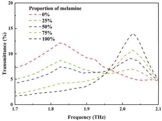 After detecting the characteristic absorption peaks of vanillin and melamine separately, a mixture of these two additives is analyzed. Figure 6 illustrates the envelope curves formed by the resonance dips of 1 μm mixtures containing different proportions of melamine. When the two additives are mixed in a 1:1 ratio, the envelope (blue curve) exhibits two distinct peaks, demonstrating the ability to distinguish between these two additives. Due to the higher peak extinction coefficient of melamine compared to vanillin, its absorption peak is more pronounced in Figure 6. As the proportion of melamine increases, its absorption peak becomes more pronounced. When the proportion reaches 75% (yellow curve), the absorption peak of vanillin almost disappears. This is because the positions of the two absorption peaks are close, and the trend of the melamine fingerprint masks that of vanillin. But the transmittance of the yellow curve near 1.83 THz remains higher than that of the black curve representing 100% melamine proportion. To quantify the distinguishability, a concept similar to the resolution in chromatographic analysis is introduced [43,44,45]. The resolution is defined as follows:
