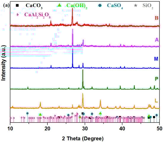 XRD data of prepared composites are illustrated in Figure 1. XRD patterns of silicate composites doped with mortar and ACC noted with M and A show the presence of SiO2 with a hexagonal structure and CaCO3 crystalline phase with a rhombohedral structure. Composite B, obtained by adding brick in the silicate glassy, shows the formation of SiO2, CaAl2Si2O8·4H2O and CaCO3 crystalline phases. The composite P consists of CaCO3 and CaSO4 crystalline phases. In the composite L containing lime, the presence of CaCO3 and Ca(OH)2 crystalline phases were identified. Composites L and P were also noticeable through the presence of small amounts of the CaSi2O5 crystalline phase.