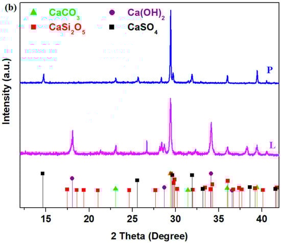 Diffractograms of the CaCO3–silicate composites: (a) B, A, M, P and P; (b) P and L samples.