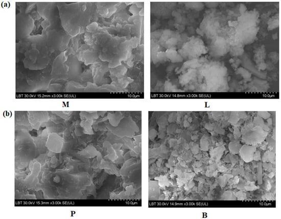 SEM micrographs of prepared composites. The scale bar was 10 µm. (a) M and L composites and (b) P and B composites.