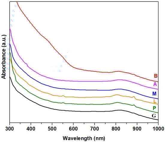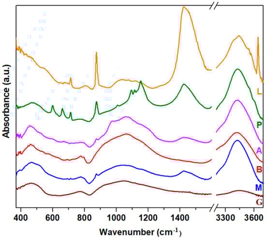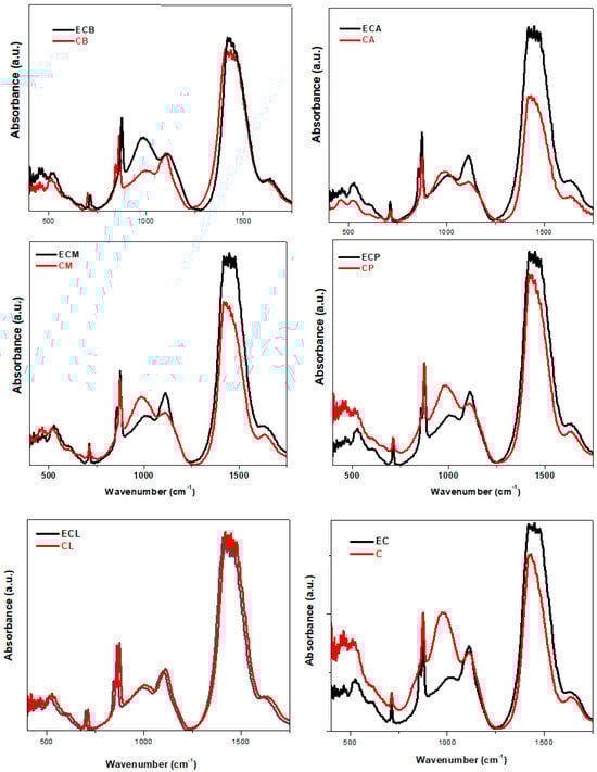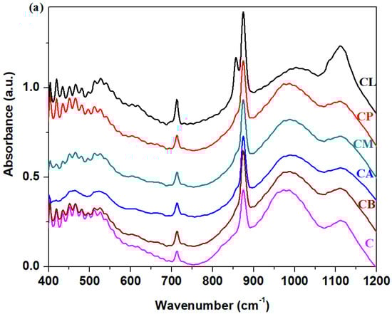 By doping with lime, plaster, mortar and ACC (composites noted with L, P, M and A), the presence of two IR bands centered at approximately 875 and 1450 cm−1 shows the formation of the CaCO3 crystalline phase. The IR band centered at approximately 1450 cm−1 is assigned to the asymmetric stretching vibrations of CO32− carbonate ions. A new IR band appears centered at approximately ~875 cm−1, corresponding to the out-of-plane bending vibrations of carbonate ions [26]. The intensity of these bands decreases after doping with plaster, mortar and ACC, attains the maximum value for the sample doped with lime, and disappears for the sample with brick.