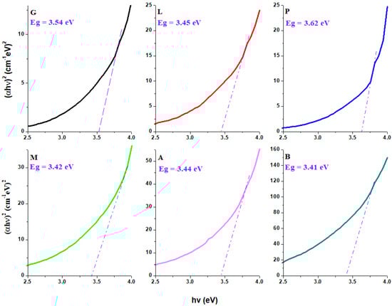 UV–Vis spectra and the plots (αhν)2 versus hν of the nanocomposites are indicated in Figure 4 and Figure 5. The UV–Vis spectra indicate a shift of the absorption edge towards a higher wavelength by doping. For the sample containing brick, the intensity of the UV-Vis absorption suddenly increased, and the absorption edge shifted towards the lower energies more than its analogs. The shift of absorption edge to low energy side occurs when the concentration of non-bridging oxygen atoms and/or defects is increased. The red shift of the absorption edge shows the reduction of the gap energy value.