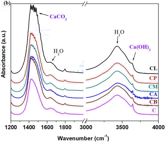 FTIR spectra of composite–cement materials containing Portland cement. (a) in the 400–1200 cm−1 region and (b) in the 1200–4000 cm−1 region.