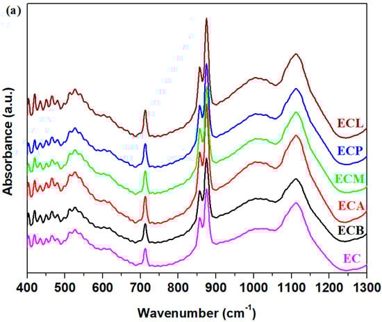 The FTIR spectra of the CaCO3–silicate composites-expired cement materials performed 28 days after their preparation can be observed in Figure 7. An inspection of IR spectra shows that the IR bands situated between 800 and 1200 cm−1 were improved gradually in their intensities by the addition of varied composites in the structure of the expired cement materials. The ascending order of increase of intensity of these IR bands is brick < plaster < mortar < lime < ACC when these composites were mixed with expired cement. For the brick composite–cement material, the intensity of these bands was almost the same as that of expired cement. These regions are attributed to the stretching vibrations of the calcium–silicates–hydrates (C–S–H) and silicate units.