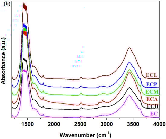 The smaller bands in intensity were observed in the region between 400 and 1100 cm−1, and the strongest absorption features near 1500 cm−1 were observed by the doping of plaster in expired cement. These modifications were referred to as the decrease in the C-S-H phase and the increase in the calcium carbonate phase. For the ECA material, the infrared spectrum shows the existence of intense IR bands assigned to the Si-O-Si bonds and carbonate vibrations bands.
