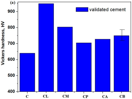 The values of Vickers hardness of the composite–cement materials were higher than those of the validated control cement. Some authors show that the complex IR bands situated between 800 and 1200 cm−1 are assigned to the presence of calcium silicate hydrate gel. The formation of C-S-H gel is responsible for the strength of the concrete [27]. The position of the IR band centered at approximately 980 cm−1 shifts to 987 cm−1 for doping with plaster, mortar, and brick and to 990 and 1005 cm−1 for ACC and lime, respectively. The intensities of the IR bands assigned to the Ca-O bonds (~855 cm−1) and the presence of Ca(OH)2 (~3645 cm−1) are also higher than control cement. The calcium ions react with the silicate network and, as a result, form a secondary C-S-H gel. The width and depth of IR bands located in the range between 800 and 1200 cm−1 are higher in the case of a composite–cement mix. These compositional evolutions suggest that a higher amount of C-S-H gel results in composite–cement materials and, therefore, a further increase in Vickers hardness. Using limestone composites mixed with validated cement results in a more compact cement material with increased strength.