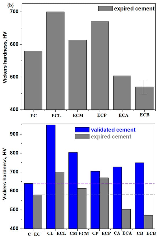 Only the presence of lime or plaster composites (L or P samples) in the cement material, either validated or expired, results in higher values of the Vickers hardness than standard Portland cement. The L and P composites have the presence of CaSi2O5 crystalline phase in their structure, which can be responsible for the formation of Ca2SiO4 and Ca3SiO5 crystalline phases of the cement according to the equation of chemical reaction: