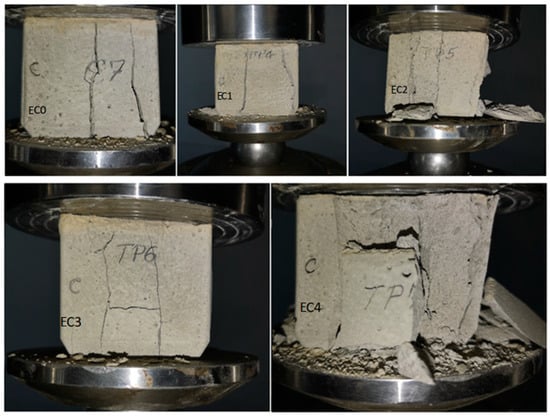 In the brick–composite cement material with expired cement (sample ECB), a downward shift in the intensity of IR bands situated between 400 and 1600 cm−1 in comparison to validated cement can be noticed. These structural changes at the micro level have a drastic effect on the mechanical properties (see Figure 9).