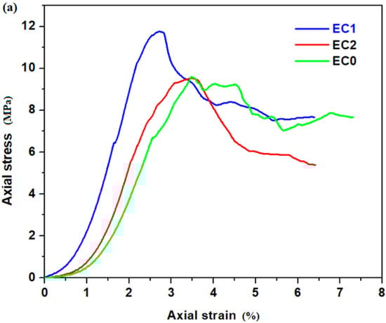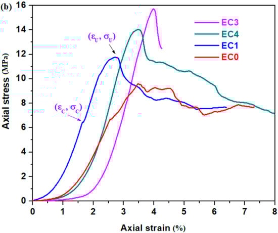 The stress–strain curve of studied specimens. (a) EC0, EC1, EC2; (b) EC0, EC1, EC3, EC4.