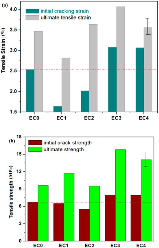 The measured axial stress–axial strain curves of the prepared specimens are plotted in Figure 11. Table 4 summarizes the parameters that represent the tensile properties of specimens, such as the initial cracking strain, εC, ultimate tensile strain, εU, initial cracking stress, σC, and tensile strength, σU. The initial cracking stress and strain, εC and σC, are the values of stress and strain at which appears the first crack on the specimen surface. The analysis of the uniaxial tensile tests of the studied specimens is shown in Figure 12.