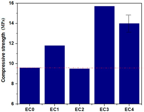 The reference group—EC0 specimen containing only expired cement—has a compressive strength of 9.6 MPa. The compressive strengths of specimen EC2 decreased, while for EC1, EC3 and EC4, the values improved comparatively with the EC0 standard etalon. When comparing the compressive strengths of EC1, EC3 and EC4, values of 11.8, 15.7 and 14 MPa were obtained, respectively. This indicates that the substitution of 2.5% expired cement with composites originating from construction and demolition enhanced the compressive strength of the standard specimen by over 22.9% for composites with lime, mortar and plaster, 63.5% for composites with iron, lead, steel iron and ash, and 45.8% for composites with nine waste in their structure, namely lime, mortar, plaster, ACC, brick, iron, lead, steel iron and ash. A replacement of expired cement with composites containing lime, mortar, plaster, brick and ACC reduces the compressive strength of the matrix by over 1%. The key factors contributing to the increase in compressive strengths of the cement matrix were the average crystallite sizes of particles in the composite structure and the formation of supplementary hydration products. The particle size of L, P and M composites was considerably smaller than that of A and B composites and, as a result, act as a fine aggregate that is more efficient for filling harmful pores within the expired cement matrix. In addition, the formation of new hydration products also contributes to the filling of the pores, and consequently, an enhancement in the strength of the cement matrix was achieved. Then, it is evident that a mixture containing 2.5% composite with metallic waste and ash exhibits notably higher compressive strength when compared to the matrix alone. This major enhancement in strength can be attributed to the suitable bridging effect within the cement matrix. Composites containing brick and ACC reduce the compressive strength of the expired cement matrix.