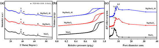 (a) XRD patterns, (b) N2 adsorption–desorption isotherms, and (c) BJH pore-size distributions of MnOx, MgMnOx, and MgMnOx-H.