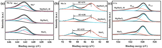 XPS analysis was employed to investigate the surface information of the catalyst. From Figure 3 and Table 1, it can be seen that Mn 2p3/2 XPS spectra can be deconvoluted into two peaks at 642.2 eV and 643.4 eV, corresponding to Mn3+ and Mn4+ species. As shown in Figure 3a and Table 1, the Mn4+/Mn3+ ratio of MgMnOx (1.21) is higher than that of MnOx (0.95). The increase in Mn valence state may be due to the partial substitution of divalent Mg for trivalent Mn ions. The Mn4+/Mn3+ ratio of MgMnOx-H (1.12) slightly decreases after acid etching but is still higher than that of the original MnOx. Furthermore, Mn 3s XPS spectra (Figure 3b) were deconvoluted to shed light on the AOS of Mn. As shown in Table 1, the AOS values for MnOx, MgMnOx, and MgMnOx-H are 3.40, 3.48, and 3.43, respectively. The change in AOS variation coincides with the trend of Mn4+/Mn3+ ratio variation. In addition, the O 1s spectra (Figure 3c) were fitted to two peaks at 529.8 eV and 531.5 eV, assigned to surface lattice oxygen (Olatt) and surface adsorbed oxygen (Oads) species, respectively [37,38]. Interestingly, the Oads/Olatt ratio of MgMnOx (0.40) increases after doping Mg in MnOx (0.32), indicating that the partial substitution of Mg for Mn ions generates more surface Ov. Furthermore, the Oads/Olatt ratio of MgMnOx-H (0.57) continues to increase after acid etching. This indicates that the partial de-doping of Mg further induces the formation of more Ov, which renders the gas-phase O2 easy to activate and convert to Oads, facilitating the deep oxidation of VOCs [39,40].