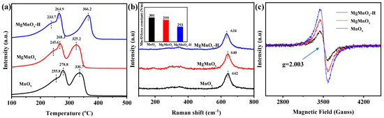 where ω is the Raman shift (cm−1), c is the speed of light, and μ is the effective mass of the Mn-O bond. As illustrated in the inset of Figure 4b, the force constant k of MgMnOx-H (293 N/m) is smaller than those of MgMnOx (299 N/m) and MnOx (301 N/m), implying that Mn-O could be greatly activated to engender a weaker Mn-O bond strength, which could facilitate Ov formation. The defect structures of the MnOx, MgMnOx, and MgMnOx-H catalysts were further measured using the EPR technique. As shown in Figure 4c, all the catalysts present a distinct feature at g = 2.003, stemming from the Ov filling with active oxygen species (i.e., O2− and O−) [44,45]. Obviously, the MgMnOx-H catalysts possess prominently more defective Ov than those in MnOx and MgMnOx catalysts. This reflects its superior redox ability of MgMnOx-H catalysts, which agrees well with the above H2-TPR and Raman results.