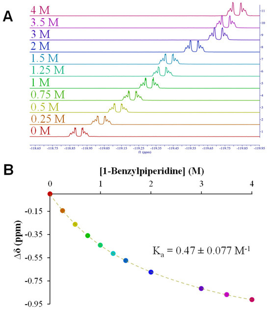Representative NMR titration for determining XB interaction strength: (A) 19F NMR spectra of the o-fluorine resonance on IPFB (XB donor) when subjected to increasing concentrations of the XB acceptor, 1-benzylpiperidine, or Fragment 5A (Scheme 2); (B) the corresponding binding isotherm that yields an association constant (Ka) indicative of XB interaction strength (solvent: cyclohexane). Note: NMR titration analyses for other fragments are provided in Supplementary Materials.