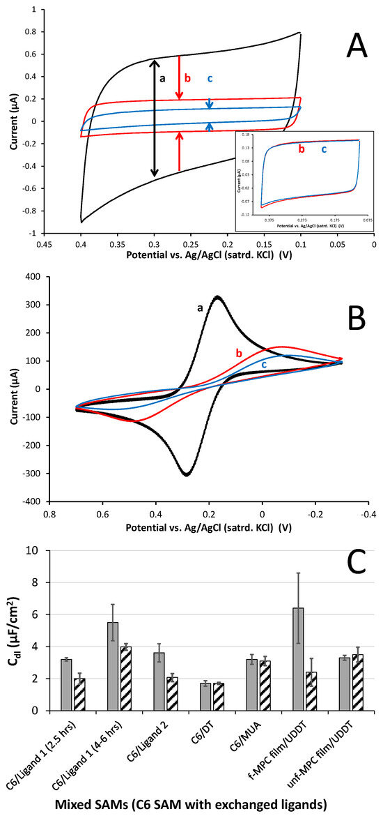 Film assemblies of both f-MPCs and unf-MPCs were created using a previously reported procedure modified for the current study [38]. That is, for MPC film assemblies at electrodes, C6-SAM-modified electrodes were first subjected to place-exchange with 5 mM dithiol-linking ligands (EtOH), either nonane dithiol (NDT, Ambeed, Arlinton Hts, IL, USA) or undecanedithiol (UDDT, Asemblon, Seattle, WA, USA), for 20–30 or 10 min, respectively, followed by 1 h immersion in a 1 mg/mL solution of f-MPCs (THF) or unf-MPCs (toluene). As in prior studies with MPC film assemblies [38,57], this cycle was repeated 2–3 times until definitive increases in the film’s Cdl were observed in conjunction with more irreversible FeCN voltammetry—both indicators of an MPC-film-modified interface.