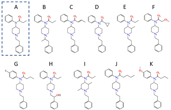 Chemical structures of (A) fentanyl (dashed) and select examples of synthetic fentanyl derivatives including (B) a-mefentanyl, (C) crotonylfentanyl, (D) cyclopropylfentanyl, (E) mefentanyl, (F) methoxyacetylfentanyl, (G) p-fluorobutyrylfentanyl, (H) ohmefentanyl, (I) phenaridine, (J) valerylfentanyl, and (K) p-methoxybutyrylfentanyl.