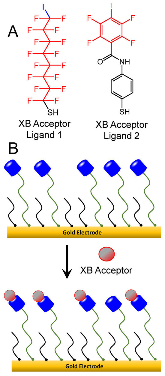 (A) XB donor ligands, hexadecafluoro-8-iodooctane-1-thiol (Ligand 1, left) and 2,3,5,6-tetrafluoro-4-iodo-N-(4-mercaptophenyl)-benzamide (Ligand 2, right), were place-exchanged into hexanethiolate (C6)-modified films to form mixed SAMs; (B) mixed SAMs featuring XB donor sites were exposed to XB acceptor molecules and tested electrochemically.