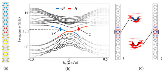 The band structures for lattices A, B, and C are calculated by the finite element method and shown in Figure 1(b1–b3). For the standard lattice C (a/R = 3) without an external magnetic field, its band structure has a double Dirac cone at , as shown in Figure 1(b3). When the lattice is compressed (lattice B with a/R = 3.68), the two Dirac cones are separated into two pairs of two-fold degenerate (blue) and (red) states and create a band gap of [11.99, 14.08] (GHz). However, lattice B does not have band inversion, meaning that it is a trivial MOPC. The eigenmode functions at the Dirac cone can be classified into , , , based on spatial parities and pseudospin basis states, and the field patterns of degenerate p and d states are shown on the right of Figure 1(b2). Differently, for the expanded lattice A (a/R = 2.88) with 2900 G, Figure 1(b1) displays that it has band inversion, indicating that it is a nontrivial MOPC. Due to the broken TRS and space inversion symmetry simultaneously, band inversion occurs to create four kinds of eigenfields [5,11,27], i.e., and . The field patterns of and states and the corresponding Poynting vectors are shown on the right of Figure 1(b1). The clockwise and counterclockwise patterns of the Poynting vectors in lattice A represent the pseudospin-down and pseudospin-up states, respectively [9,28].