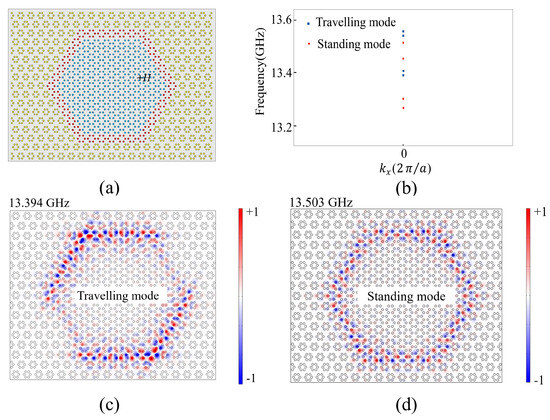 We have calculated the resonant modes of the PCRR by the finite element method. The results in Figure 3b show that the PCRR supports multiple resonant modes within the topological band gap. Due to the six 120° corners in the PCRR, the degeneracy of a pair of cavity modes is lifted to form a pair of new modes called the traveling mode and standing mode (Figure 3b). Figure 3c,d present the field distributions of two typical modes oscillating at 13.394 GHz (travelling mode) and 13.503 GHz (standing mode). In order to understand the difference between the travelling mode and standing mode clearly, we provide two dynamic GIF figures as Figure S1 in Supplementary Materials. The dynamic GIF figures clearly demonstrate the evolution of the field distribution when its phase varies from 0 to 2π. One can find that the Ez field flows clockwise along the boundary of the PCRR for the travelling mode at 13.394 GHz. Differently, for the standing mode at 13.503 GHz, the EM wave cannot flow and is localized at the boundary of the PCRR. It should be noted that in the topological bandgap, there are several groups of travelling modes and standing modes with similar properties [32,33] which play a major role in the coupling phenomenon between the topological waveguide and the PCRR [34,35].