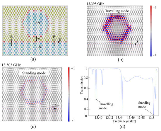 Based on the above analyses, we further construct a two-port structure consisting of a straight ACB sandwiched waveguide and a PCRR, as shown in Figure 4a. The waveguide channel contains only one layer of lattice C. The distance between the PCRR and the straight waveguide is 2a. The lower part PC (i.e., lattice A) is applied with −H to support the pseudospin-down state propagating leftwards in the straight waveguide. The input and output ports are marked as and , respectively. A pseudospin-down source (S−) marked by a black star is placed on the right side of . Due to the coupling effect between the waveguide and the PCRR, the resonant frequencies are slightly changed. For example, the typical resonant frequencies at 13.394 GHz in a pure PCRR shift to 13.395 GHz now, and their field distributions are shown in Figure 4b,c. Obviously, for the case of 13.395 GHz, the EM wave can be easily coupled into the PCRR and then return the waveguide to propagate leftwards unidirectionally. However, for the standing mode at 13.503 GHz, since it has weaker coupling efficiency than the travelling mode at 13.395 GHz, after the EM wave enters the PCRR, it is well confined in the PCRR and hardly goes back to the waveguide again. These results are consistent with our previous analysis. Figure 4d presents the transmission spectra within the bandgap. The transmittances for 13.395 and 13.503 GHz marked by two dots as travelling mode and standing mode, respectively, also verify the previous analyses.