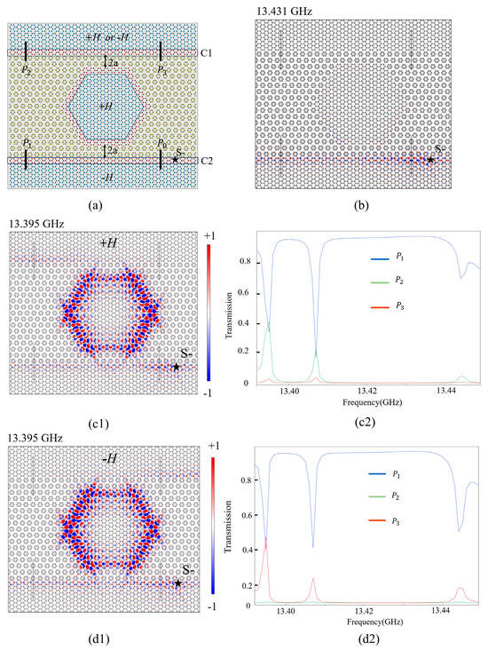 The working mechanism of the controllable ADF is explained as follows. Figure 5b shows the simulation result for a non-resonant frequency at 13.431 GHz. Due to the non-resonant property, the EM wave propagates along C1 and does not couple with the PCRR, leading to total transmission from to . When +H is applied to lattice A above C1, the field distribution at 13.395 GHz and the transmission spectra of three output ports within the bandgap are calculated, and they are shown in Figure 5(c1,c2). The incoming EM wave from is divided into two parts. One still transmits in C2 and exports from , while the other is coupled with the PCRR and coupled into C1, so it ends up exporting from . Similarly, Figure 5(d1,d2) show the results when the EMF applied to lattice A above C1 is reversed from +H to −H. The EM wave is also divided into two parts. One part still exits from , while the other part is coupled to exit from instead of , meaning that the dropping energy can be switched to exit from different ports by controlling the direction of the EMF applied to lattice A above C1. In other words, the topological waveguide-resonator system can be considered to be a topological ADF because it can easily add or remove signals to the output ports of waveguides.