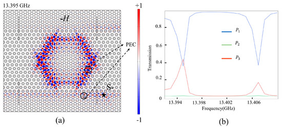 In addition, we investigate the robustness of the ADF by introducing two perfect electronic conductor (PEC) defects into the structure. One PEC is placed in the C2 channel, while the other is placed inside the PCRR, as denoted in Figure 6a. We apply −H for lattice A above C1. The field distribution at 13.395 GHz and transmission spectra of 13.392–13.412 GHz are shown in Figure 6a,b. Obviously, the EM wave bypasses the PECs to propagate forwards, only causing local phase change, but it has almost no influence on the transmittances at , , and . From Figure 6b, one can find that the transmission spectra are almost the same as that without defects in Figure 5(d2). These results prove that the structure has strong robustness against PEC defects, which provides excellent tolerance for the fabrication of ADF.