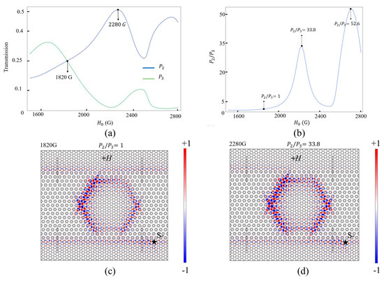 (a) Transmission spectra of the power output at and when +H = 1500~2800 G; (b) the power ratio of when +H = 1500~2800 G; (c,d) field distributions for = 1:1 and 33.8 at +H = 1820 and 2280 G, respectively.
