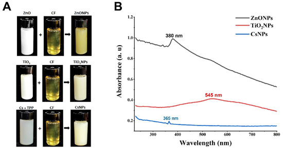 Preparation procedure of ZnONPs, TiO2NPs, CsNPs, and UV-Vis spectra. (A) Reagents before and after the reaction. (B) UV-Vis spectra showing the peaks of ZnONPs, TiO2NPs, and CsNPs.