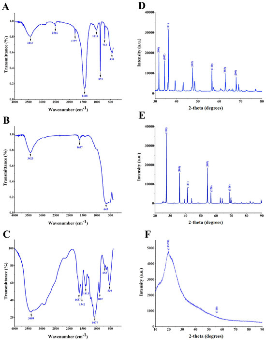 Fourier transform infrared spectra and X-ray diffraction spectra of biosynthesized nanoparticles. (A) FTIR spectra of ZnONPs; (B) FTIR spectra of TiO2NPs; (C) FTIR spectra of CsNPs; (D) XRD spectra of ZnONPs; (E) XRD spectra of TiO2NPs; and (F) XRD spectra of CsNPs.