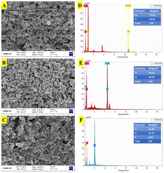 SEM and EDS characterization of biosynthesized nanoparticles. (A) SEM images of ZnONPs; (B) SEM images of TiO2NPs; (C) SEM images of CsNPs; (D) EDS of ZnONPs; (E) EDS of TiO2NPs; and (F) EDS of CsNPs.