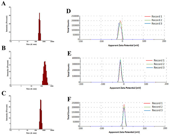 DLS and ZP distribution of biosynthesized nanoparticles. (A) DLS distribution of ZnONPs; (B) DLS distribution of TiO2NPs; (C) DLS distribution of CsNPs; (D) ZP distribution of ZnONPs; (E) ZP distribution of TiO2NPs; and (F) ZP distribution of CsNPs. Reruns of the experiment are represented by Records 1–3.