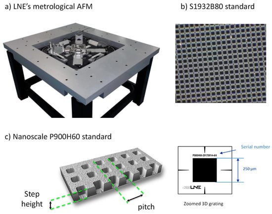 Finally, the most important stage in the qualification of the instrument is the magnification calibration, which includes a linearity study in both the horizontal and vertical directions. In our laboratory, the traceability of measurements is ensured by using a transfer standard, P900H60, designed by the LNE and produced by the Centre for Nanoscience and Nanotechnology (C2N, CNRS/Université de Paris-Saclay, Palaiseau, France) [22]. This reference structure is a 3D grating with a 900 nm nominal pitch along the XY axes (see Figure 2). It is composed of a succession of lithographed patterns with an average depth of 60 nm and an average grating pitch of 900 nm. An electron beam lithography system (Raith-Vistec EBPG 5000+) was used to fabricate the PMMA masks. The reactive ion etching technique was then applied to the masks to produce the gratings.