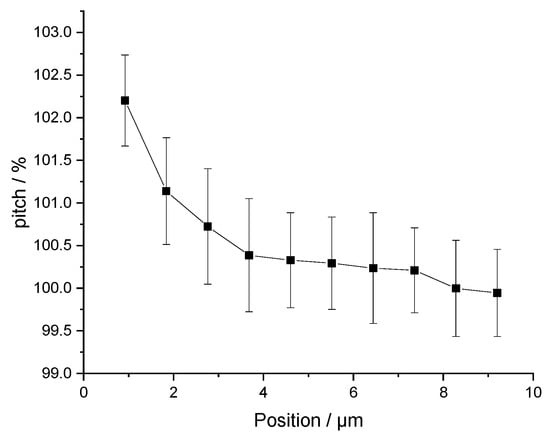 The images acquired with P900H60 allow us to assess the leading edge distortion. When scanning a new line, the beam is deflected to change direction leading to a variation in scan speed at the beginning of each line. If this deviation is significant, the first pixels have to be omitted for both calibrations and NP measurements. Therefore, the pitch between each pattern of a P900H60 sample was measured along the X-axis for a total of ten pitches. The results are shown in Figure 4. The non-linearity of the scan is observed and represents a relative difference of 2.2%. On average, for the left quarter of the image the relative deviation is 0.5% and becomes 0 for the left third of the image. Regarding nanoparticle size measurements, this effect can be considered negligible for the following reasons: (i) the effect will only be applied to a tiny portion of nanoparticles in the image and (ii) the relative deviation decreases rapidly, so this effect is infinitesimal compared with other sources of uncertainty.