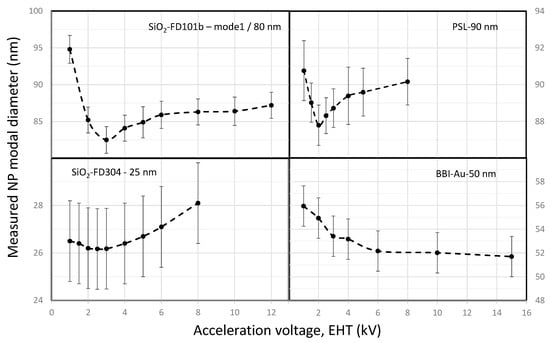 EHT dependence of the NP modal diameters measured on various nanomaterials: 80 nm FD-101b, 25 nm FD-304 and 90 nm PSL nanoparticles and 50 nm nanogold from BBI.