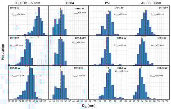 Histograms showing the size distribution of the four studied samples (FD-101b, FD-304, PSL and BBI nanogold) compiled from measurements performed at different acceleration voltages (EHT) ranging from 1 kV to 10 kV. The value of the modal diameter is given for each histogram to highlight the impact of the EHT parameter on the measured size.