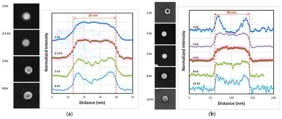 SEM images of 26 nm FD-304 (×40,000) (a) and 80 nm FD-101b (×20,000) and (b) silica nanoparticles at different EHT ranging from 1 kV to 12 kV. Profiles of each nanoparticle are measured along the NP diameter and are displayed to the right of the SEM images.