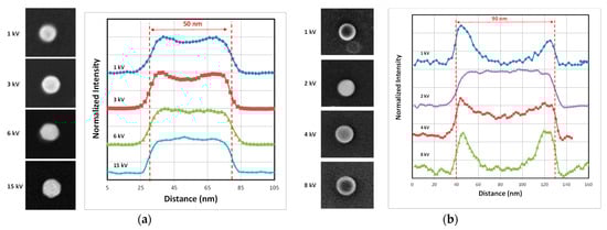 To further understand the impact of the nature of the substrate on the measured profiles, a single 82 nm FD-101b nanoparticle was deposited on a carbon film and imaged at several voltages between 3 kV and 7 kV in Figure 11b. The evolution of the profiles for a particle deposited on silicon or carbon is very different. These results show the importance in SEM metrology of the substrate on which NPs are deposited. The edge effects observed with silicon substrates are not observed for carbon substrates. The signal-to-noise ratio for particles deposited on carbon reaches a maximum at around 3 kV but no signal broadening is observed. The edge effects observed in Figure 11a can effectively be explained by the convolution of the signals from the NP/silicone substrate and multiple interactions with SEs. The secondary electrons generated by the silicone substrate and escaping from the surface can penetrate the NP and interact with its atoms to generate new SEs.