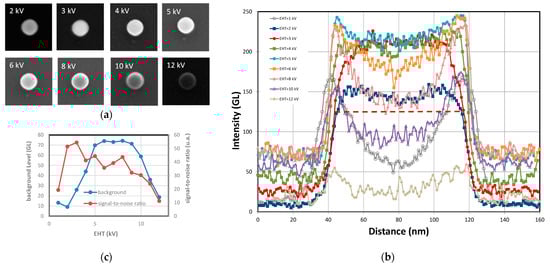 (a) SEM images of a single 75 nm FD-101b particle (×50,000) deposited on Si-wafer and acquired at different EHT; (b) line-scan profiles associated with these images at various EHT; and (c) intensity of the silicon background and signal-to-noise ratio of the profiles as a function of EHT.