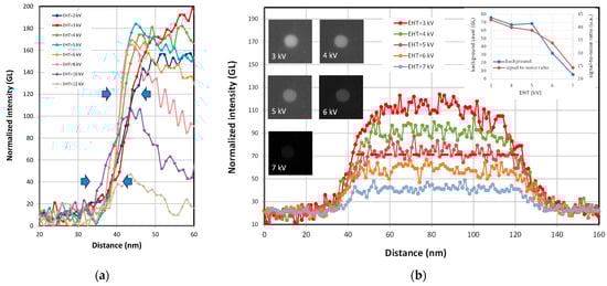 Higher than 12 kV, the contrast and brightness are no longer adequate and the particle is difficult to observe. In the measurement profiles (Figure 10b), from 3 kV onwards, the signal widens and the central part deepens, while the total signal intensity decreases as the voltage increases. In Figure 10c, the background level corresponding to the silicon surface signal and the signal-to-noise ratio of the particle relative to the silicon substrate are plotted on a graph. We can see that the signal-to-noise ratio peaks at around 3 kV, while maintaining a minimal background signal. The background signal increases and reaches a plateau with an EHT between 5 and 9 kV. Over this voltage range, the profile widens and reaches its maxima before decreasing sharply. Additional details regarding the edge effects measured on the 75 nm FD-101b NP are included in Figure 11a. The signal has been normalised to better observe the widening of the signal as a function of EHT. This broadening of the signal profile is due to a convolution effect between the signal coming from the NP and the substrate.