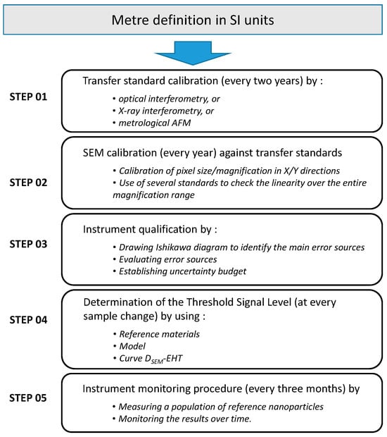 Assessing uncertainties is a lengthy process, but it is necessary to evaluate confidence in a measurement. Type A and B uncertainties must be evaluated (step 03) according to the principles of the GUM (Guide to the Expression of Uncertainty of Measurement) and guidelines as summarized in this document [30]. This work must be applied to each type and size of nanomaterial, as well as to any SEM instrument.