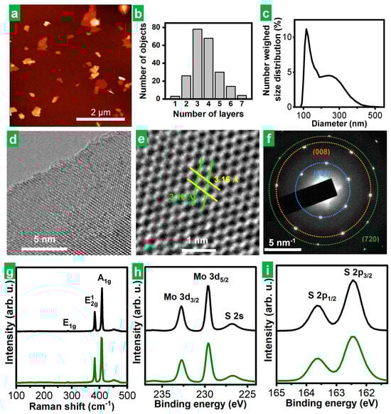 Microscopic and spectroscopic characterization of the solvent-extracted material derived from the cathodically expanded MoS2 using HTMABr as the electrolyte confirmed that it consisted of individual, stand-alone, multilayer 2H-phase MoS2 NSs of high structural quality. Indeed, the atomic force microscopy (AFM) images of the product depicted NSs of irregular polygonal shapes (Figure 3a) with lateral sizes typically in the range of several hundreds of nanometers. Assuming a thickness of MoS2 monolayer of ~1.9 nm and a height offset of ~1 nm [8], we concluded that the exfoliated NSs were typically between 2 and 6 monolayers thick (Figure 3b). The electrochemically exfoliated MoS2 material obtained in this work compared favorably in terms of flake thinness with a typical liquid-phase exfoliated MoS2 material, lpe-MoS2 (see the Section 2 for details on its preparation), which displayed thickness between ~7 and 30 monolayers (see Figure S1b in Section S1 of the Supplementary Materials). As previously indicated by the A-band position for MoS2 dispersions (Table 1), ee-MoS2 nanosheets obtained using HTMABr as electrolyte were also found to be thinner on average than those obtained different ammonium salts as electrolytes by AFM (see representative images and the corresponding histograms in Figure S2, Section S1 of the Supplementary Materials, for the case MoS2 obtained with THABF4 and TMOABr). Dynamic light scattering (DLS) measurements yielded hydrodynamic diameters for the colloidally dispersed ee-MoS2 NSs roughly between 80 and 460 nm (Figure 3c). Using the quantitative relationship between hydrodynamic diameter and NS lateral size previously developed for graphene and other 2D materials [42], the actual lateral size of the MoS2 NSs was estimated to stretch between 50 and 700 nm, which was in reasonable agreement with the microscopy results (see Figure 3a). Figure S2 HR-TEM images of the MoS2 revealed their high structural quality (Figure 3d). Atomic resolution images of the basal planes and the corresponding SAED patterns (Figure 3e and Figure 3f, respectively) disclosed their hexagonal symmetry and unit cell parameters.