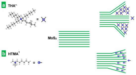 Schematic of the intercalation and exfoliation of layered MoS2 by tetraalkylammonium and alkyltrimethylammonium cations. Intercalation and exfoliation of MoS2 with (a) larger cross-section tetraalkylammonium cations, and (b) alkyltrimethylammonium cations, with a smaller cross-section in the direction of the long alkyl chain.